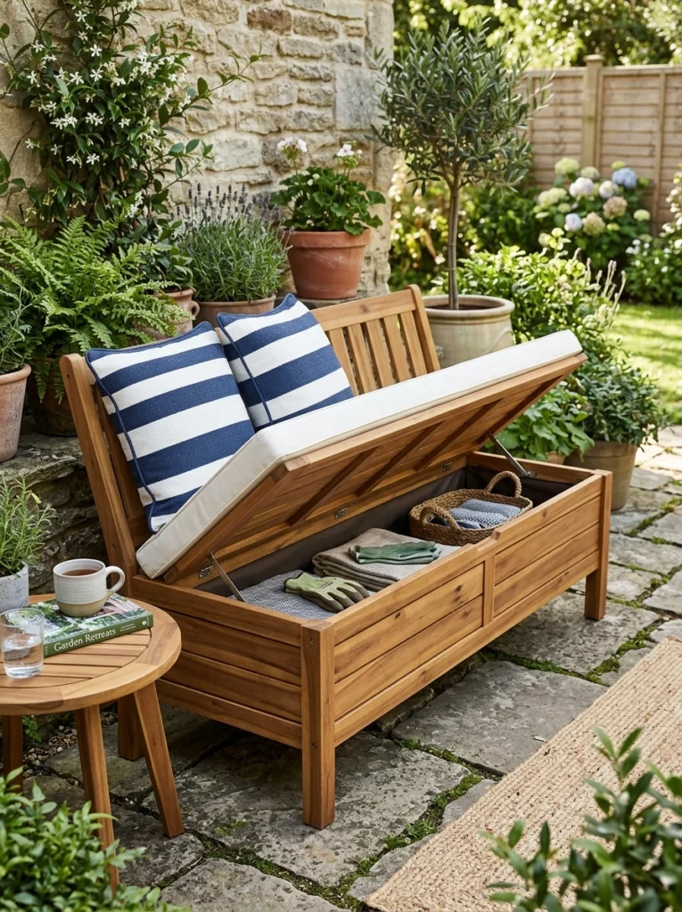 If your furniture isn’t working overtime, you’re doing it wrong! A wooden storage bench pushed against the railing acts as a generous sofa and a secret hiding spot for gardening tools or extra cushions. Throw a custom-cut outdoor cushion on top to make it look expensive and built-in.