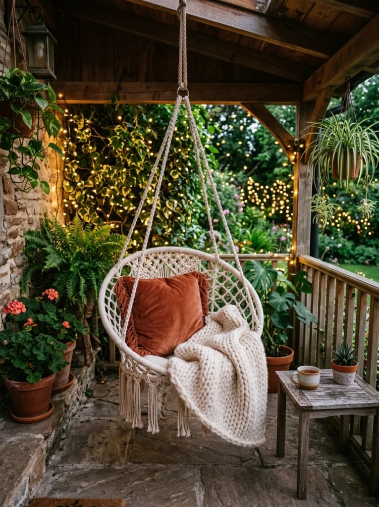 Ditch the bulky armchair and hang a macrame hammock chair from a sturdy overhang. It frees up all your precious floor space while giving you the dreamiest, boho spot to read. Just throw in a textured lumbar pillow and a cozy throw blanket for chilly evenings.