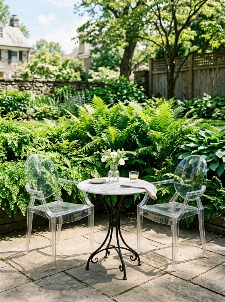 Want to trick the eye into thinking you have way more space? Acrylic “ghost” chairs are my favorite designer secret for tiny patios. They provide full-sized comfort without interrupting your line of sight, making the area feel airy and completely uncluttered.