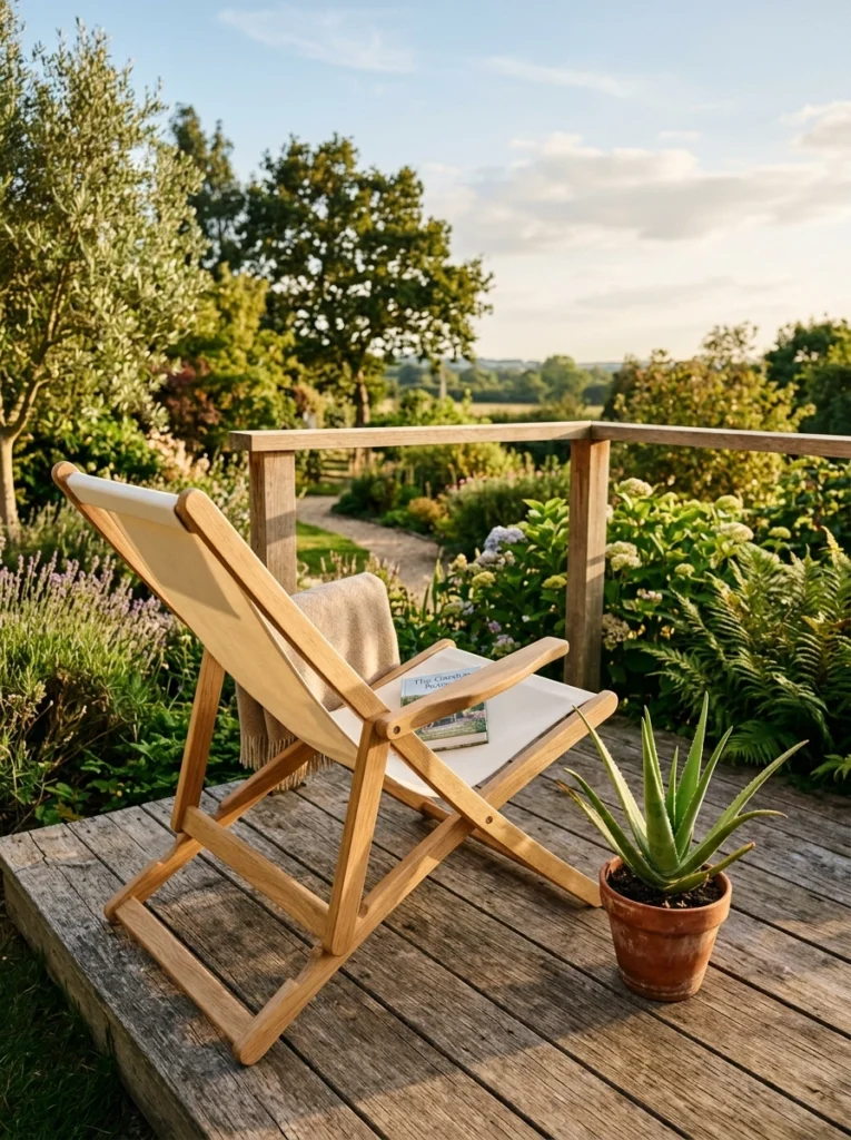 You can still have that laid-back lounging experience without those massive, heavy wooden chairs that eat up your whole deck. Look for modernized, low-profile folding lounge chairs made of canvas and lightweight wood. They give you that deep lean-back feel but fold flat in a closet when winter hits.