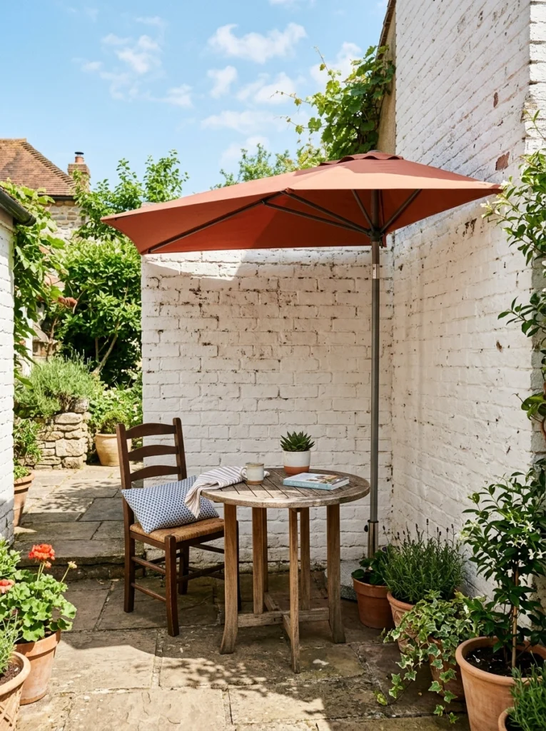 Don’t let a tight footprint burn you out in the summer sun! Half-umbrellas are designed to stand flush against a wall, giving you crucial shade without a massive base tripping you up. They look incredibly chic and custom when paired with a small dining setup.
