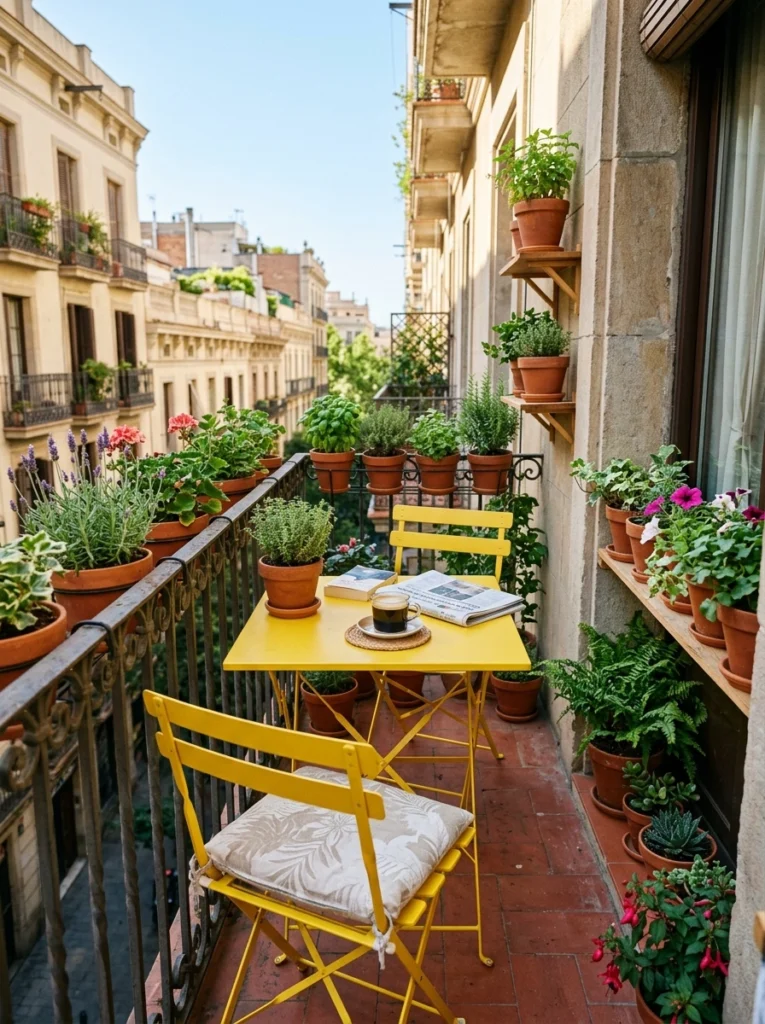 You really can’t go wrong with a classic French-inspired folding bistro set. They practically vanish when you fold them up against the wall, but when open, they’re perfect for morning lattes. Plus, a pop of bright yellow or mint green metal instantly adds personality without taking up visual weight.