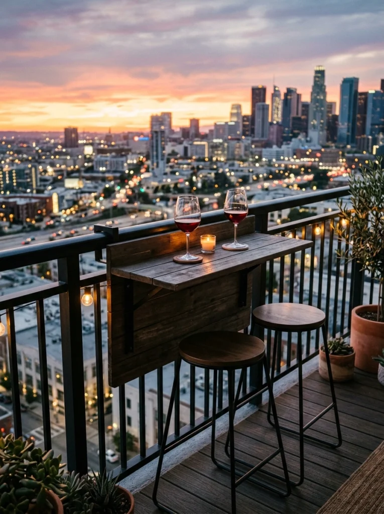 This is the ultimate space-saver for narrow urban balconies. A drop-leaf table mounts directly to your railing or wall, flipping up when you want to eat and dropping down completely flat when you’re done. Pair it with a couple of backless bar stools that slide right under.