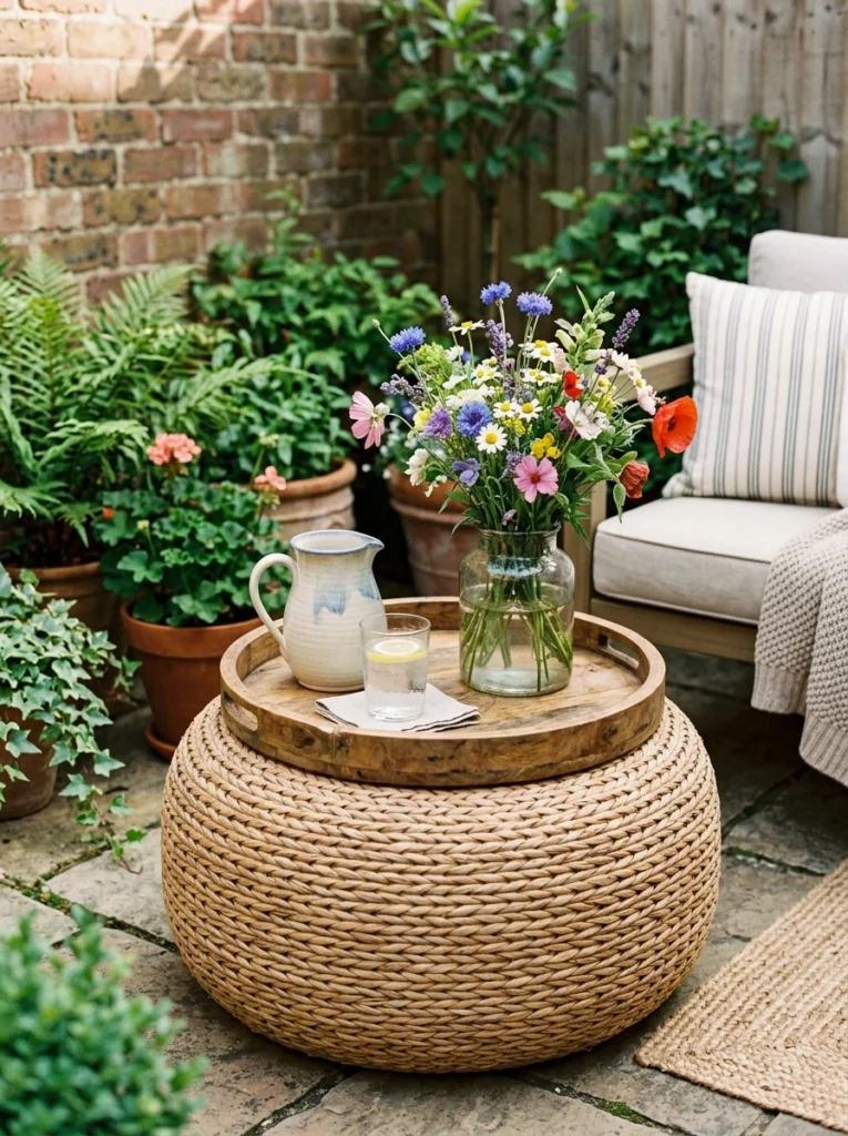 Grab a sturdy outdoor ottoman and invest in a beautiful oversized wooden tray to set on top. Boom—you have a coffee table! When you need an extra seat, just lift the tray off and serve your drinks elsewhere, which is the kind of flexibility small spaces desperately need.