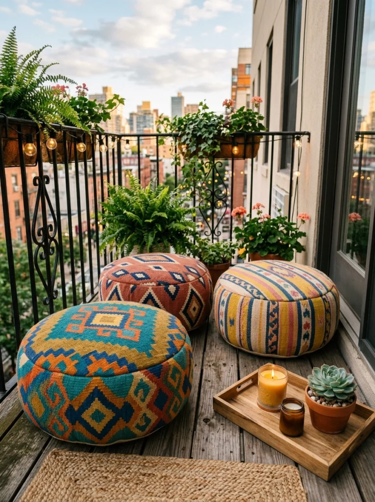 Who says you even need traditional chairs? A cluster of oversized, outdoor-rated floor poufs brings a totally relaxed, Moroccan-riad vibe to your balcony. They’re super easy to stack in a corner when you need standing room, and they double as footrests when you don’t.