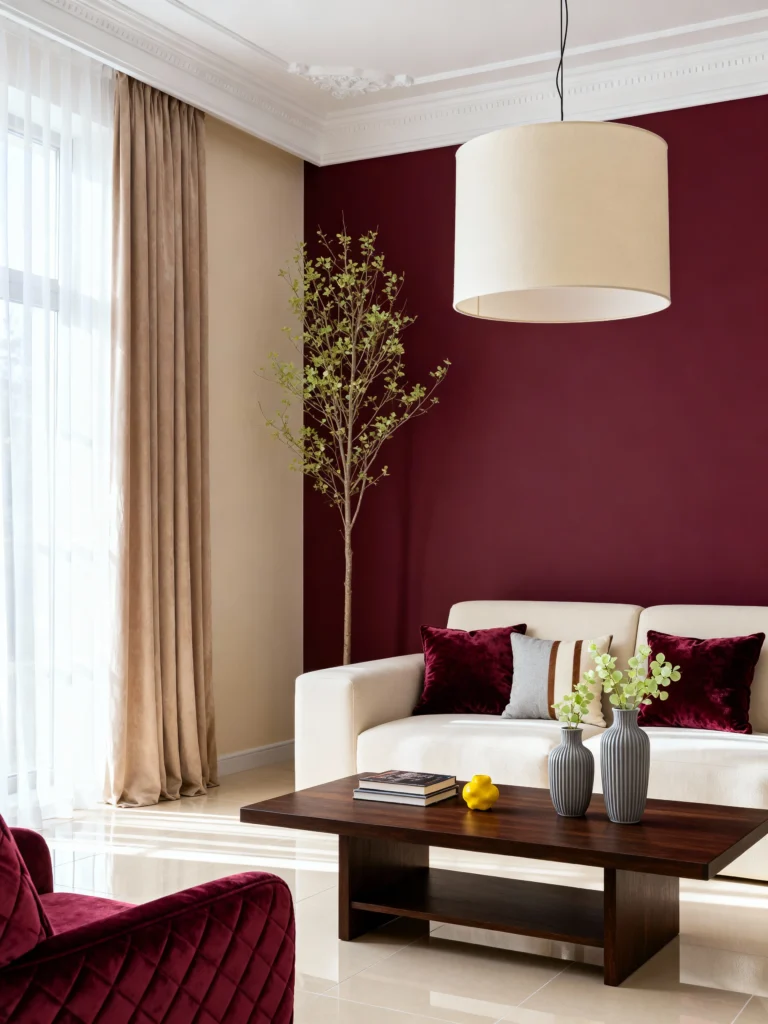 This look is pure sophistication! Painting one accent wall in a deep, beautiful merlot instantly creates a luxurious, moody vibe. The creamy couch and light flooring prevent the color from feeling too heavy, while the plush velvet throw pillows tie the furniture to the accent wall. It’s warm, inviting, and a little bit dramatic.