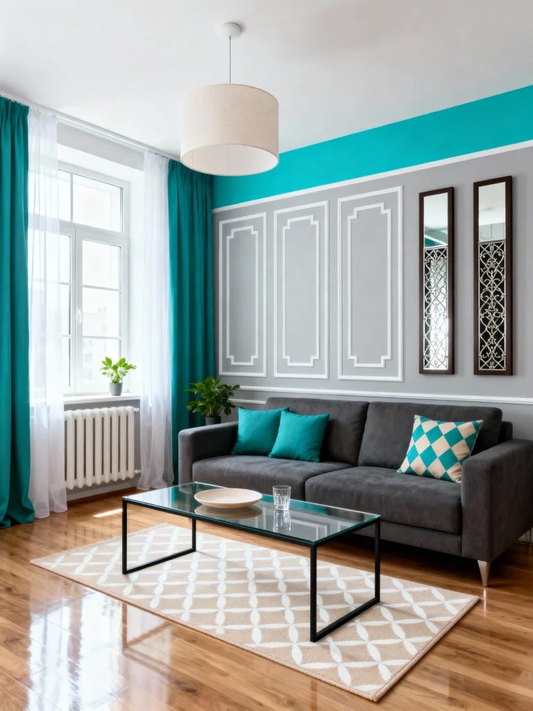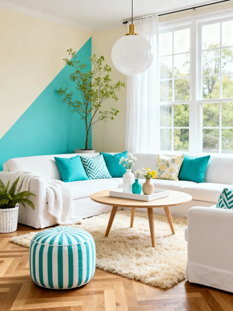 - Cool contrast: Pair the bright teal with warm, creamy neutrals like light tan or beige.