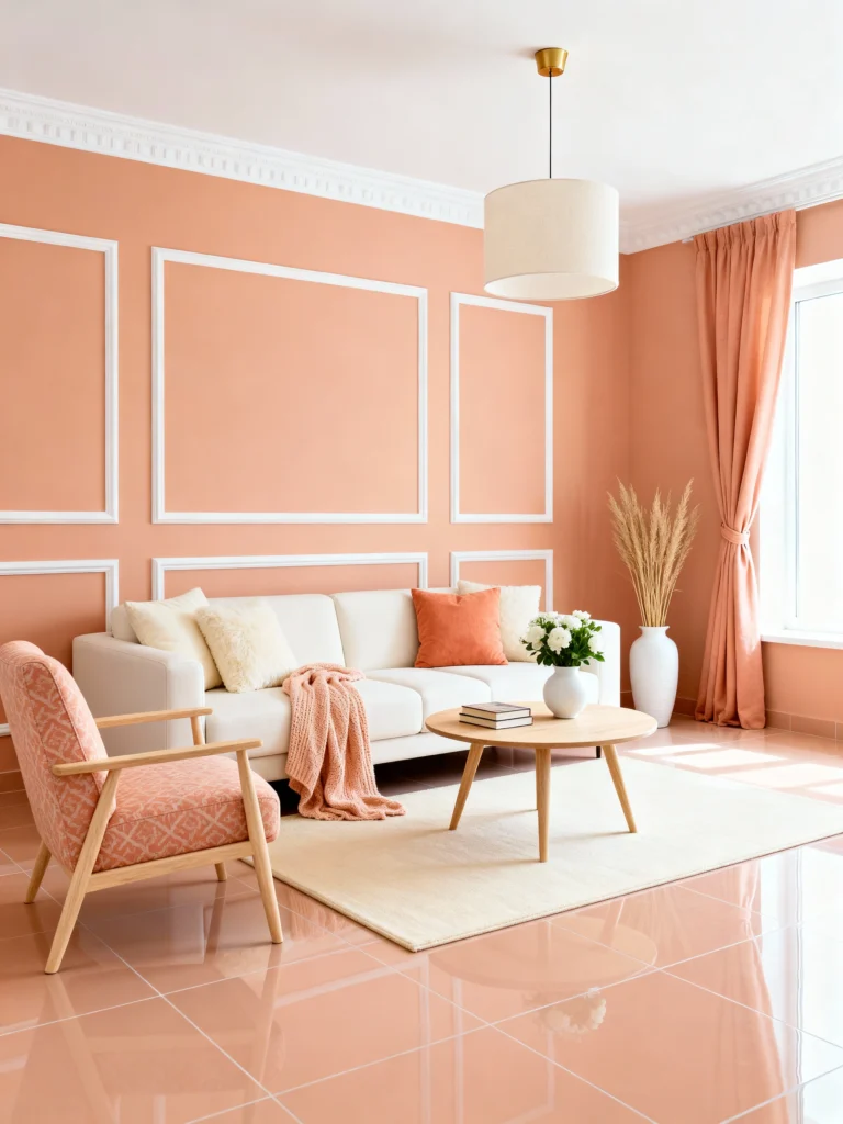 How dreamy is this light peach color? It’s a warm, gentle neutral that feels much more interesting than plain beige. It casts a lovely, soft glow, making the room feel cozy and inviting. The white picture-frame moulding is a classic touch that really elevates the look and highlights the beautiful color.