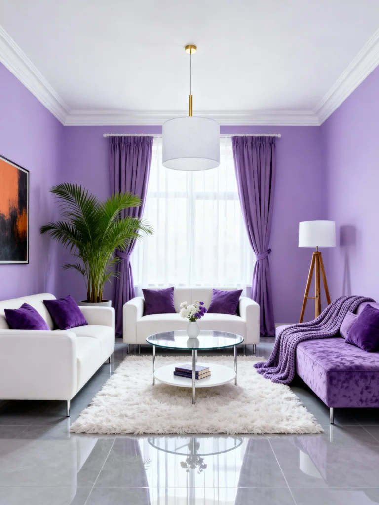 - Dark wood contrast: Black or dark wood furniture creates definition against the light walls.