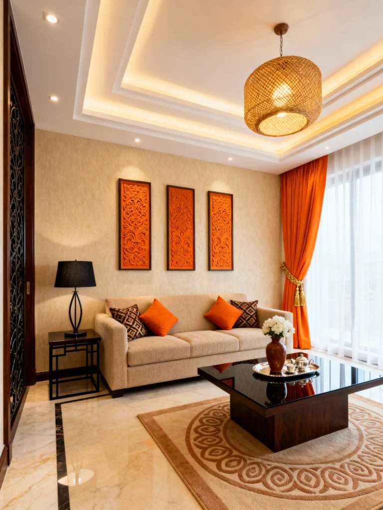 This living room proves that a beautiful neutral doesn’t have to be boring. This warm sandstone beige is rich and inviting, especially when layered with textures like the woven wall panels. The contrasting pops of burnt orange in the pillows and curtains add a wonderful, exotic warmth, creating a luxe, global-inspired look.