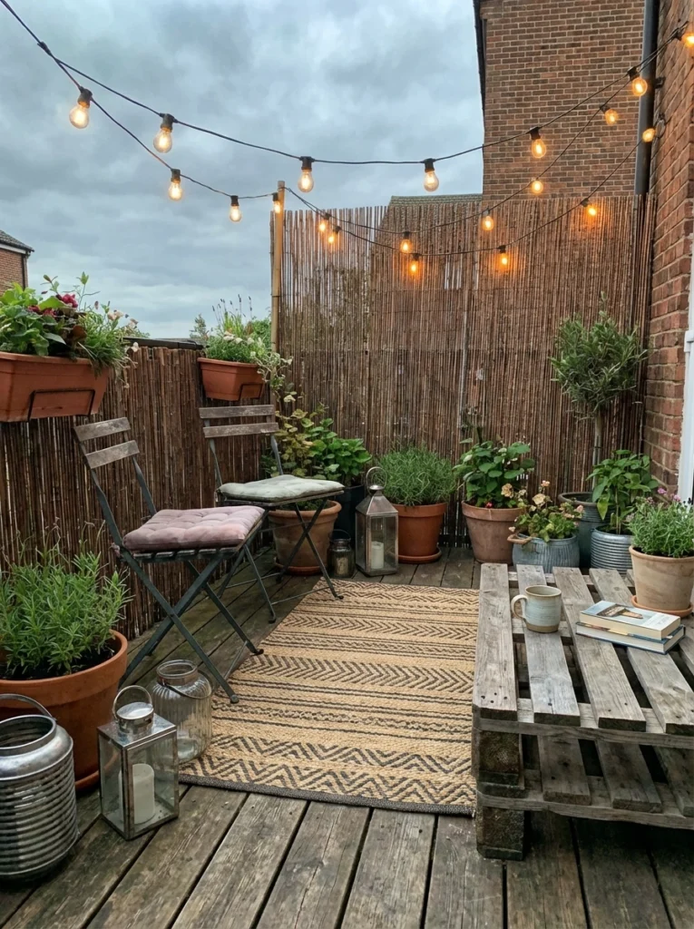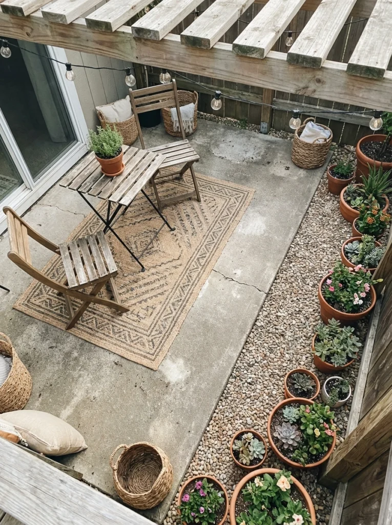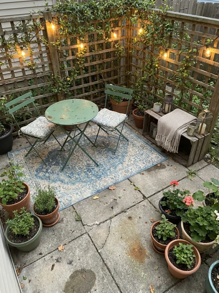 Great lighting hides a multitude of flaws. Draping basic string lights overhead and placing a few inexpensive, battery-operated floor lanterns in the corners creates incredible ambiance. It’s the ultimate cheap patio décor trick to make the space feel magical at night.