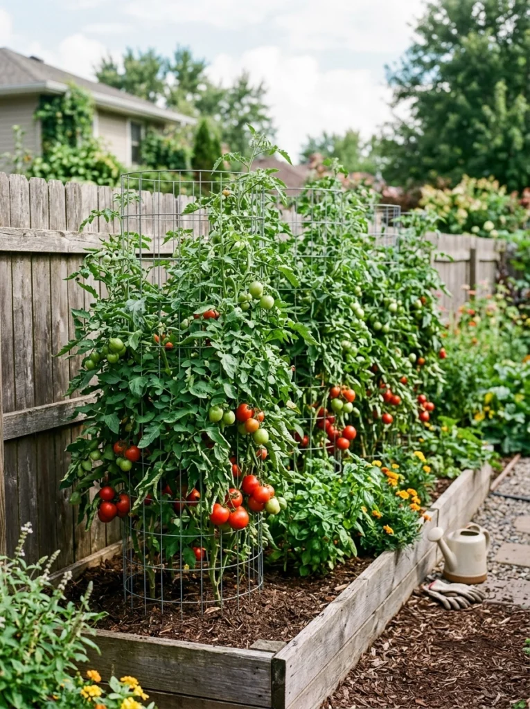 Fence-line growing beds keep chaotic vines contained. Use heavy-duty tomato towers for indeterminate tomatoes, placing a water barrel area nearby for easy access. Don’t let vines sprawl on the wet ground.
