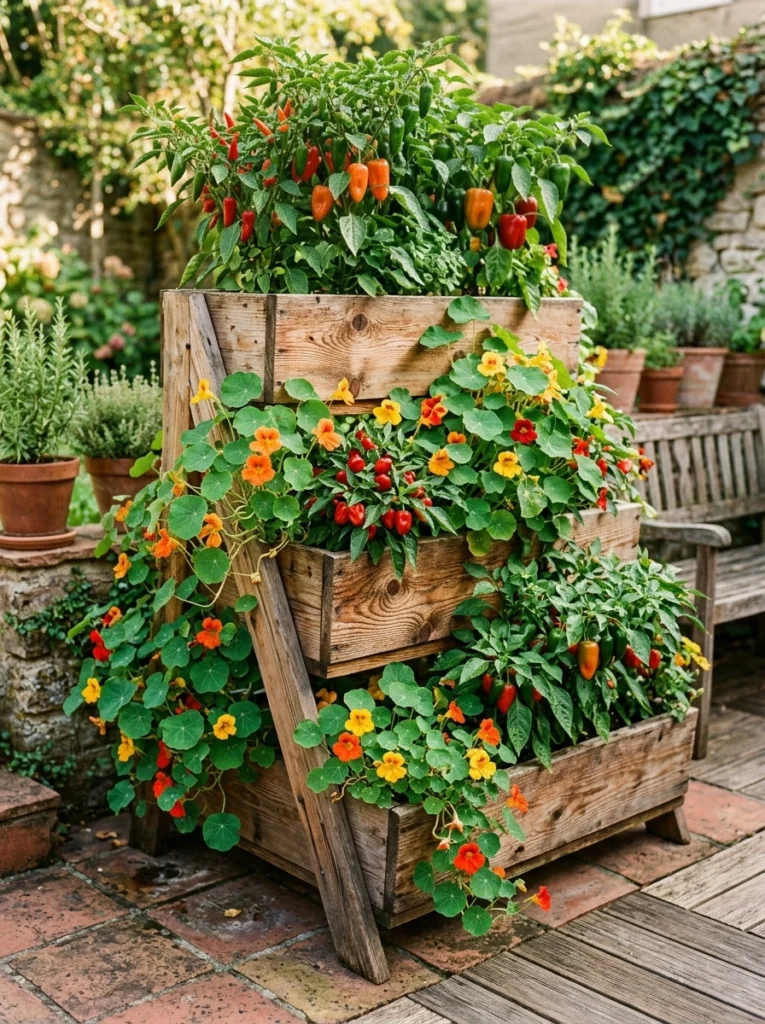 Tiered planter systems offer a premium look that stacks crops for max sun exposure. Use companion planting with peppers and nasturtiums. Avoid using shallow, cheap pots that dry out in hours.
