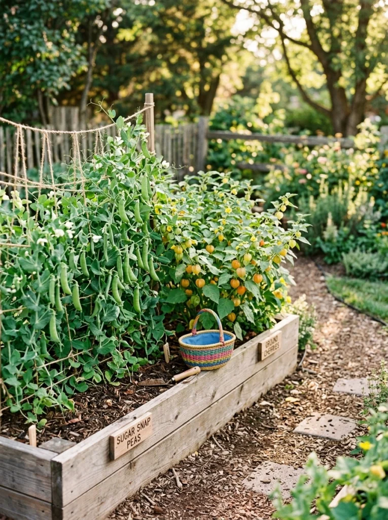 Design a low bed as a kid-friendly harvest zone with sweet sugar snap peas. It encourages family food goals and gets kids outdoors. Never plant thorny or toxic ornamentals near this specific area.