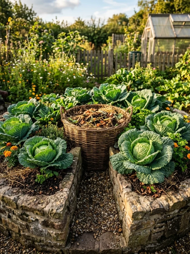 This circular bed features a central compost basket to feed heavy feeders like cabbage continuously. It’s the ultimate way to grow more food in less space. Letting the center compost dry out stops the nutrient flow.