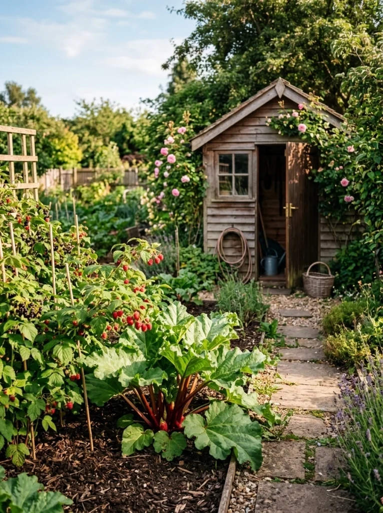 Mimic nature by planting low-maintenance berry bushes along your fence, integrating tool storage and netting. It requires low maintenance time while yielding year after year. Avoid overcrowding the roots when first planting.