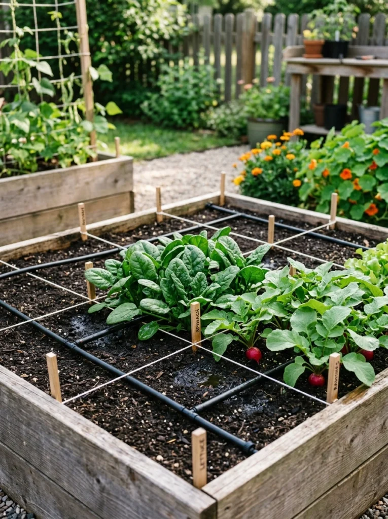 Dividing your productive garden layout into 1-foot grids allows for intense succession sowing. Great for low-cost DIY food garden setups, you can pack radishes and spinach tightly with a drip irrigation line. Avoid planting too close without airflow to prevent mildew.