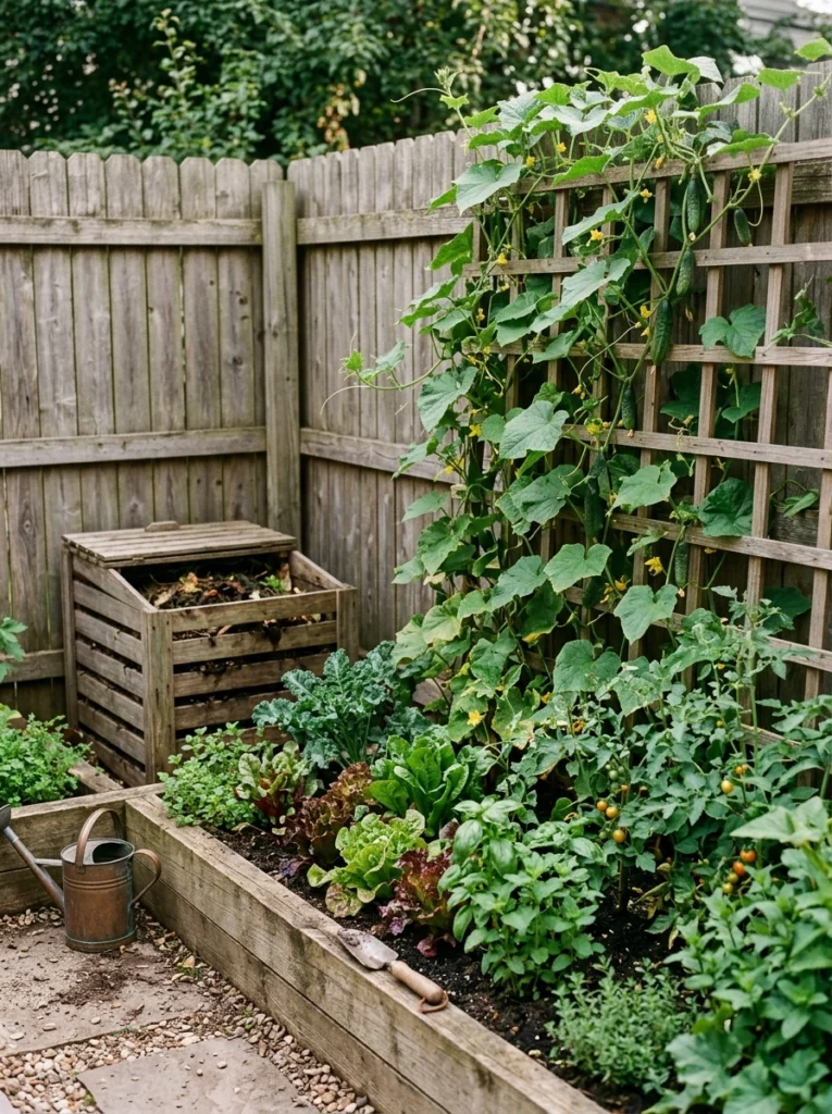 Corner edible gardens utilize existing fencing for support. A perfect tiny backyard vegetable garden feature, use trellises for cucumbers and add a compost station corner. Wasting vertical space here is a huge mistake!