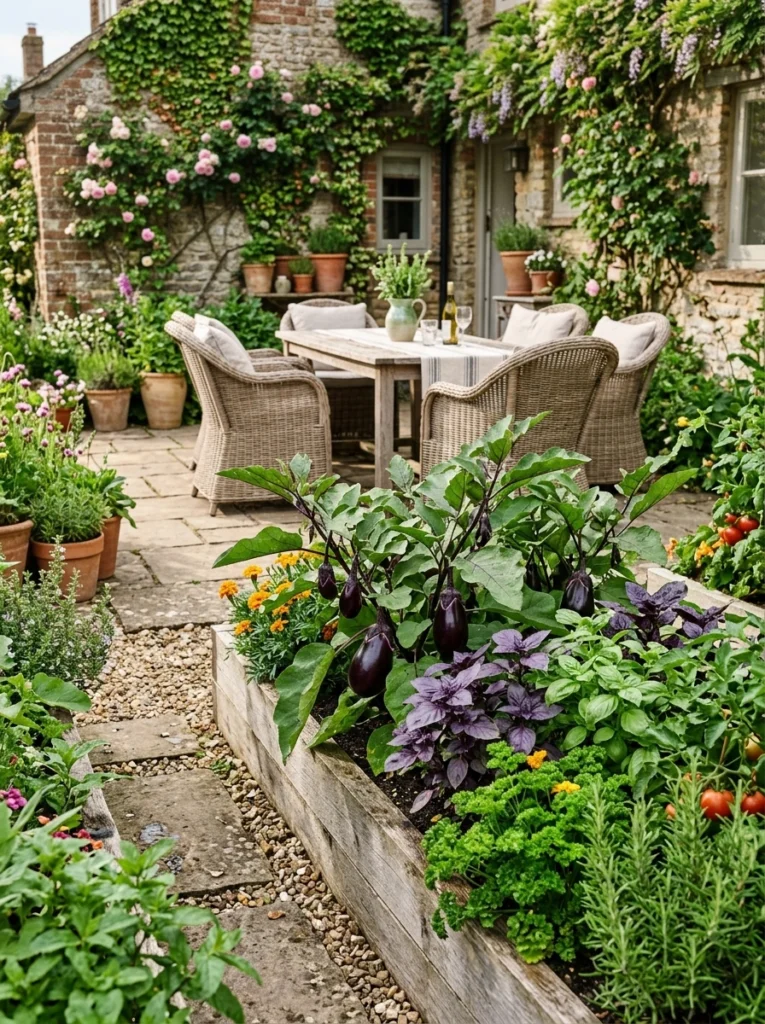 Courtyard kitchen gardens blend aesthetics with high yields near the house. Mix ornamental-edible layouts like eggplant and basil around outdoor dining spaces. Growing random crops with no plan will ruin the designer edible garden look.