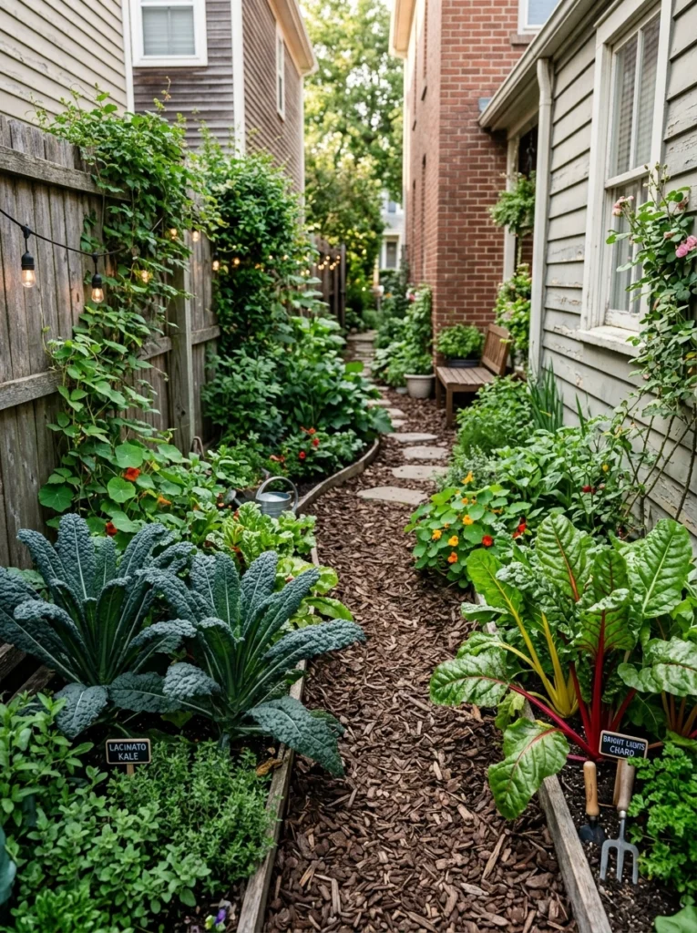 Turn dead space into narrow side-yard edible gardens using heavy mulching and string garden lighting. Ideal for shade-tolerant kale and Swiss chard, it adds growing zones to previously ignored areas. Just be careful not to overshade crops.