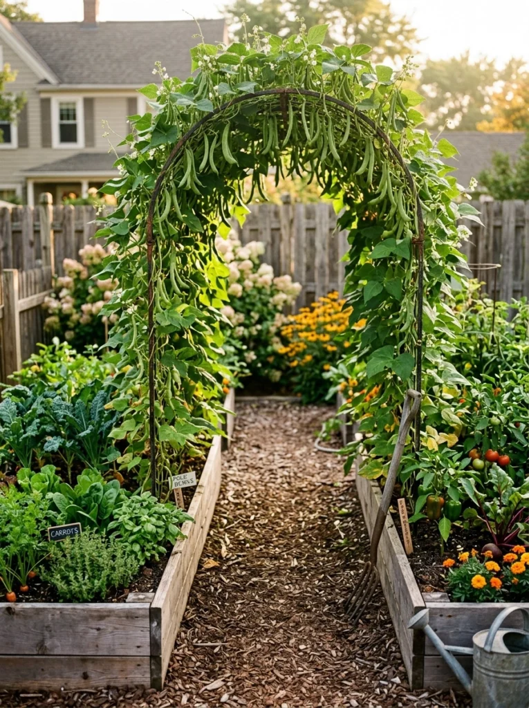 Connecting two beds with an arch doubles your vertical space for vining squash. These make fantastic backyard food garden ideas, visually stunning and highly productive. Leaving heavy vines untied will snap the stems, so tie them well.