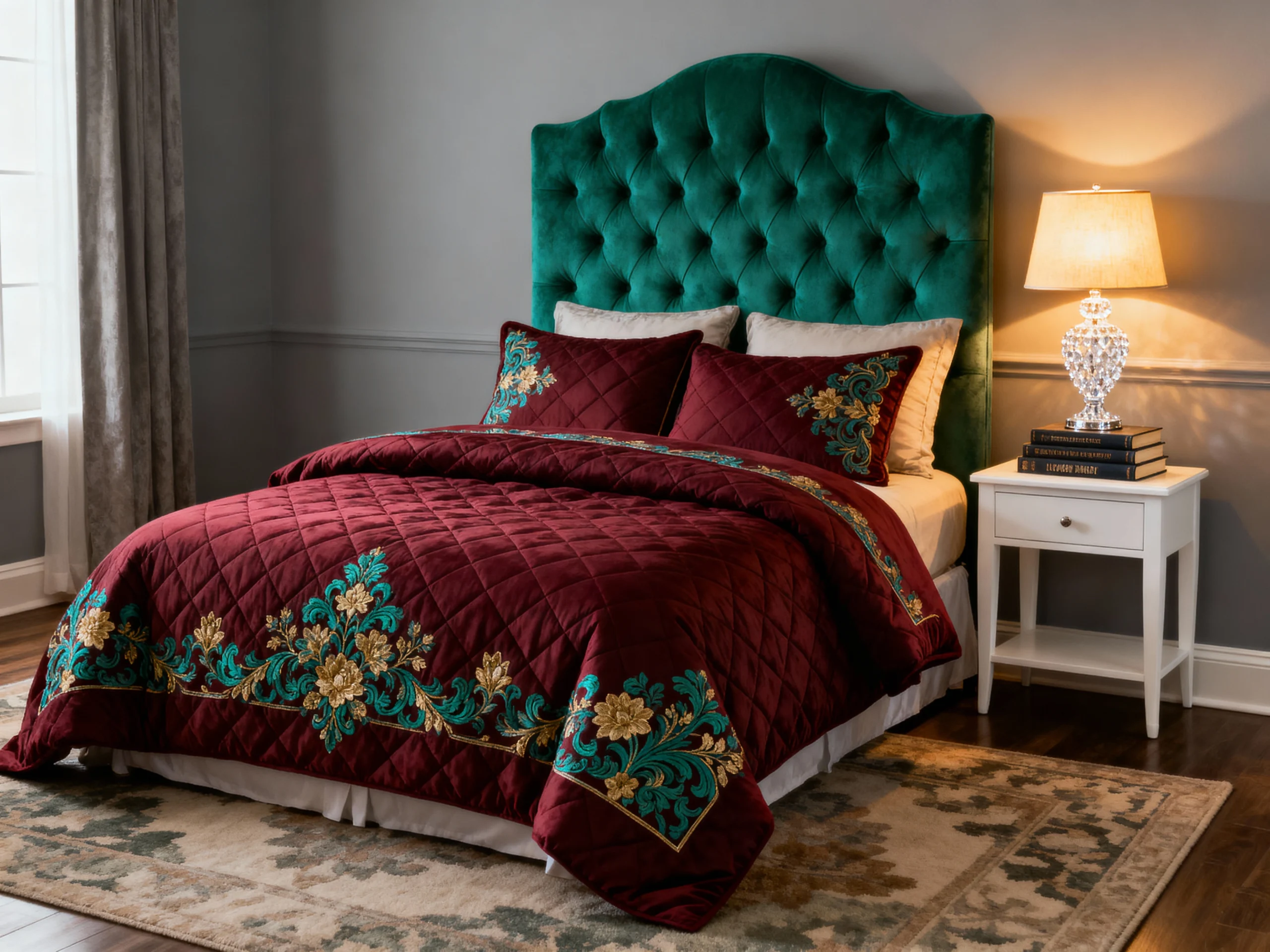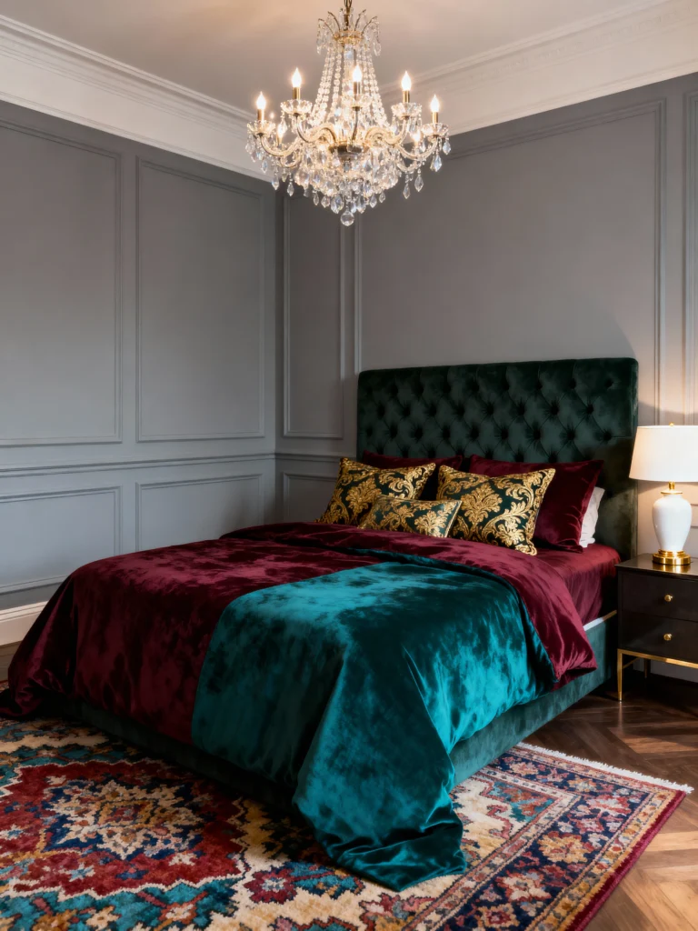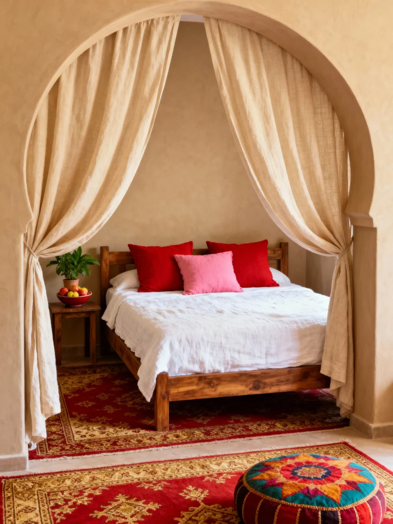 Layer your bed with luxurious fabrics like silk, velvet, and embroidered linens in rich jewel tones. Deep reds, emerald greens, and sapphire blues evoke Moroccan style. Don’t forget a thick, cozy rug underfoot for added warmth and texture.