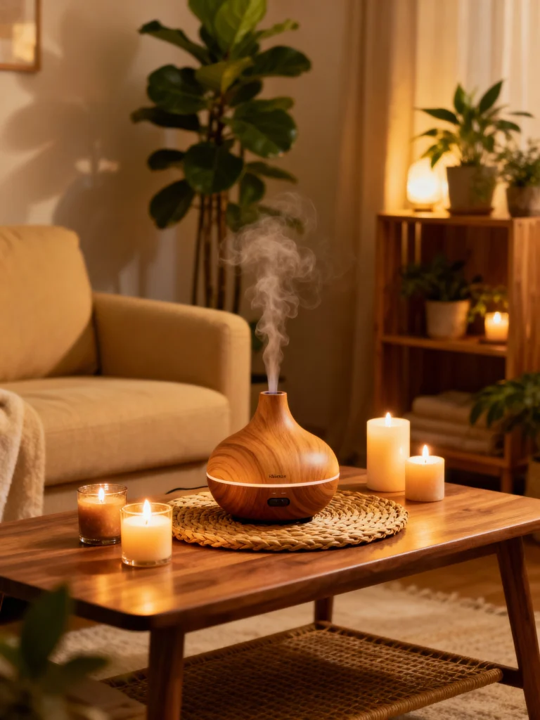 Fill the room with soothing scents using an essential oils diffuser and create a tranquil atmosphere. Choose calming scents like lavender or sandalwood. The diffuser can also add a subtle, ambient light.