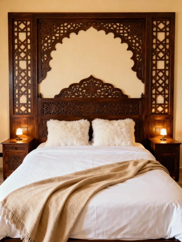 A hand-carved wooden headboard, adorned with geometric Islamic patterns, becomes a focal point. This piece showcases Moroccan craftsmanship and adds an artistic element. Consider a headboard made of cedarwood for its aromatic qualities, enhancing the sensory experience.