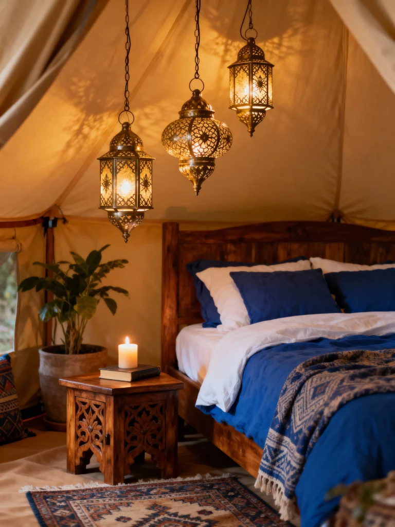Suspend intricately designed metal lanterns from the ceiling or place them on nightstands. Their warm, patterned light creates a magical ambiance. Opt for lanterns with colored glass for an even more vibrant effect, casting colorful shadows across the room.