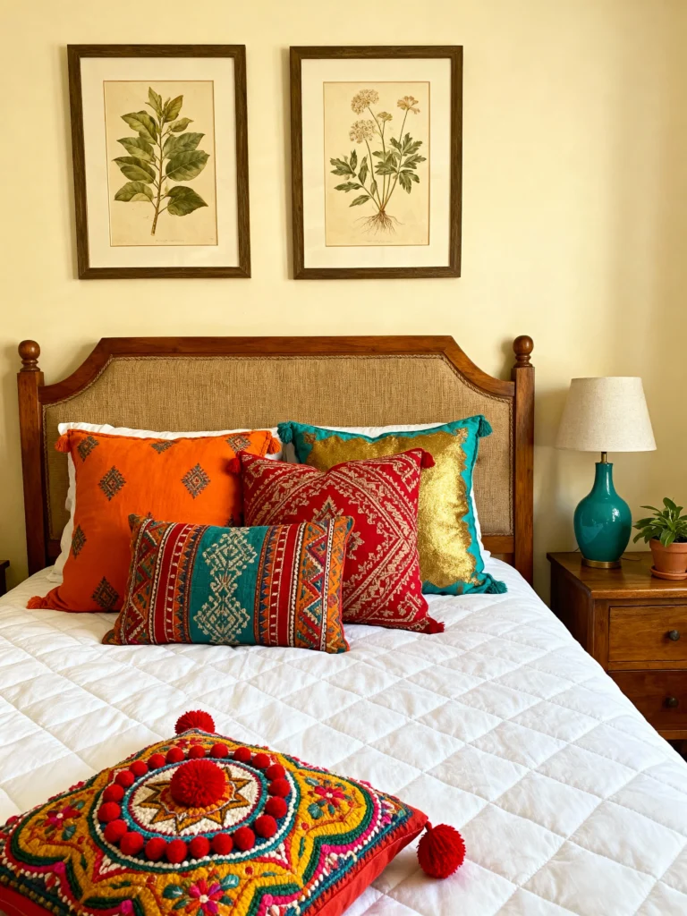 Scatter an array of colorful throw pillows in various textures and patterns on the bed for a cozy feel. Mix and match sizes, shapes, and fabrics for visual interest. Embroidered or tasseled pillows add an authentic Moroccan touch.