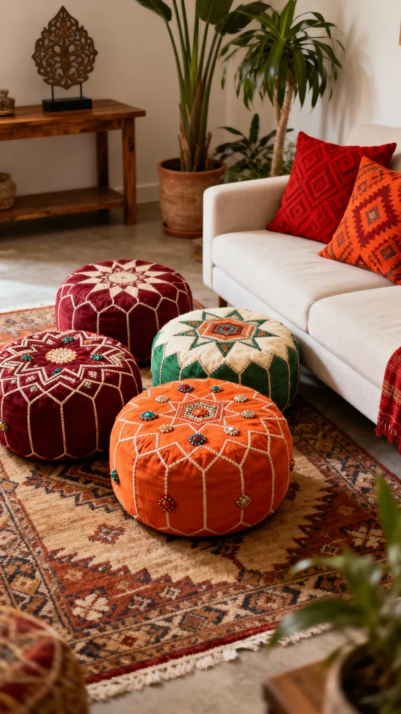 Add versatile seating options with plush Moroccan poufs in vibrant colors and patterns. These can serve as footrests, extra seating, or even side tables. Choose poufs made of leather or fabric, depending on your preference.