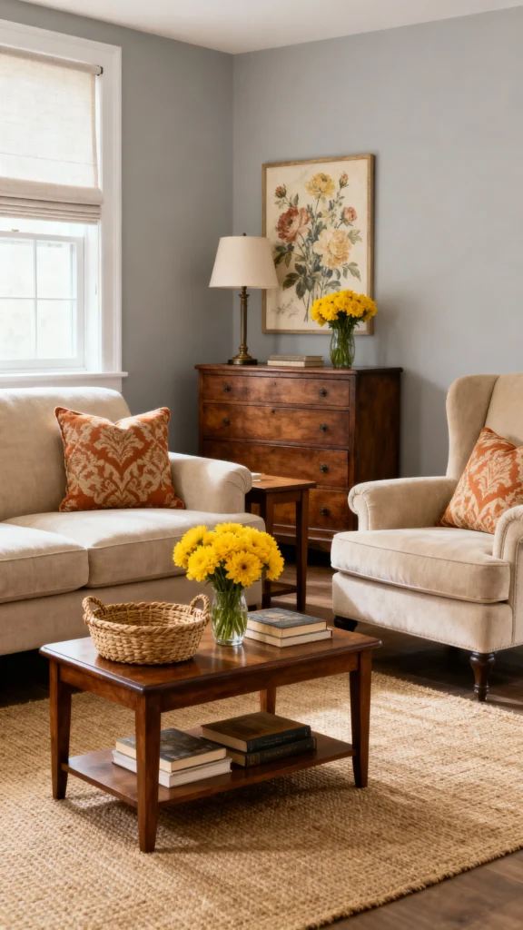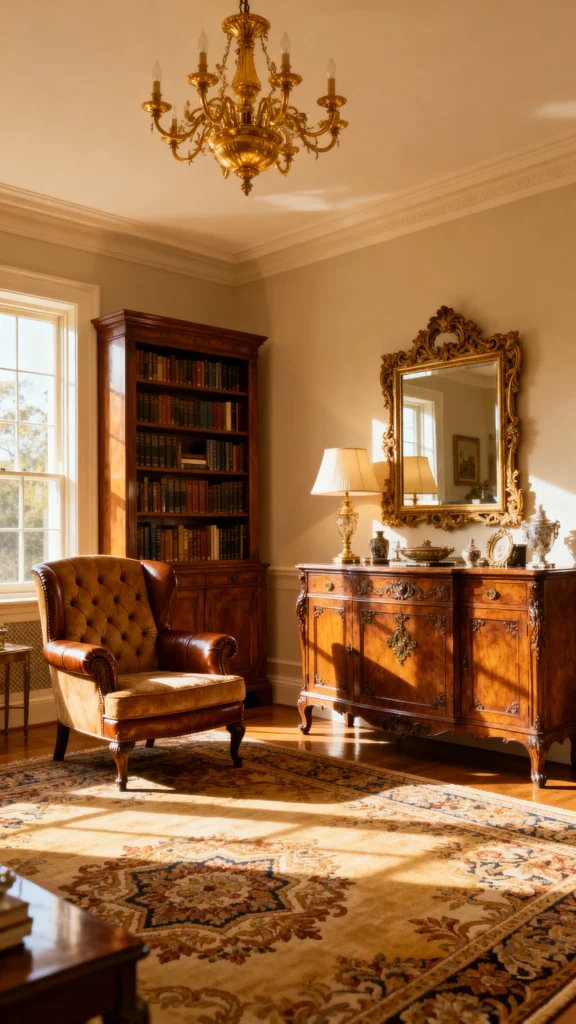 Antique accents can truly elevate your living room’s charm. Think about adding a vintage mirror or a classic bookshelf to create a cozy feel. These pieces not only showcase history but also add a personal touch to your English-inspired interiors.