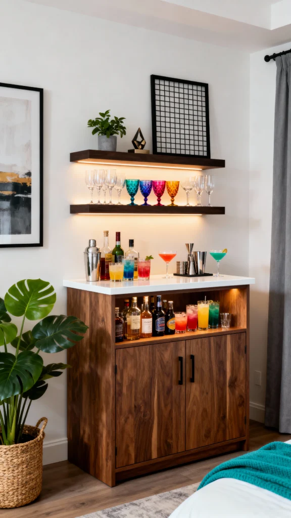 Transform a cozy corner into a delightful mini bar with floating shelves. Arrange colorful glasses and your favorite drinks for a fun and inviting look. This setup not only saves space but also brings a touch of charm to your bohemian bedroom.