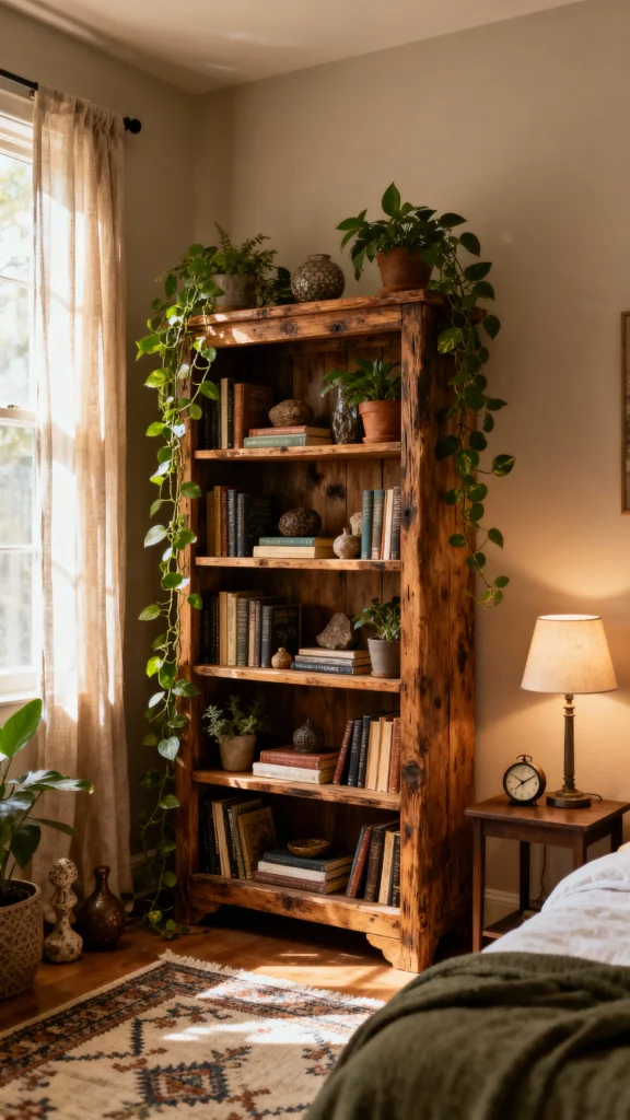 Vintage knickknack shelves add a personal touch to your bohemian bedroom. They showcase your favorite collectibles, art pieces, and memories in a cozy corner. Plus, mixing different textures and colors makes your space feel warm and inviting.