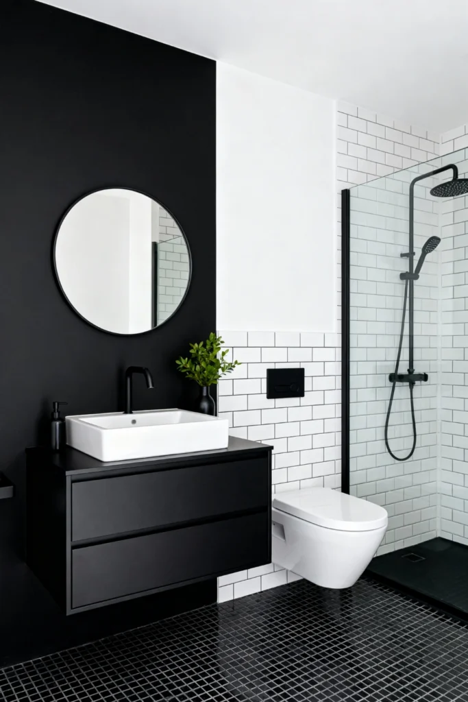 Paint an accent wall in a deep, matte black to make your round mirror completely pop. Choose a floating black vanity with clean lines and pair it with a crisp white vessel sink. Use classic white subway tiles with dark grout on the surrounding walls for a timeless, graphic look. Install sleek, matte black shower hardware and a matching faucet to tie the dark elements together. Lay down small, square black floor tiles to ground this striking, monochromatic space.