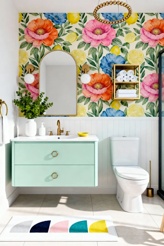 Go bold with a vibrant, oversized floral and citrus wallpaper to instantly energize your mornings. Install a pastel mint-green floating vanity to complement the bright hues on the walls. Choose brass or gold hardware, like a sleek arched mirror and a small open shelving unit, to add a touch of glamour. Keep the lower half of the walls crisp with white beadboard to balance the busy pattern above. Throw down a playful, colorful bath mat to tie the whole cheerful palette together.