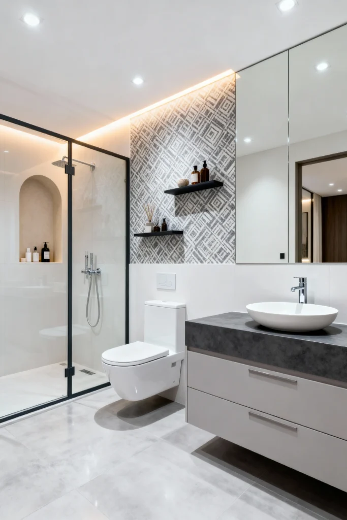 Create an arched shower niche with subtle, warm lighting to instantly elevate your daily routine. Apply a subtle geometric wallpaper on an accent wall to add depth without cluttering the aesthetic. Choose a soft grey floating vanity topped with a dark, concrete-style counter and a bright white vessel sink. Mount sleek, black floating shelves to display your favorite amber glass bath products. Lay large-format, light grey tiles across the floor to give the room a sweeping, uninterrupted, and airy feel.