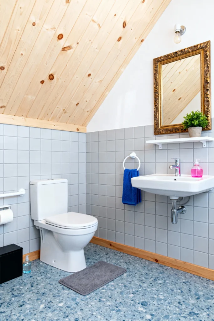 Embrace a slanted ceiling by covering it in light, knotty pine planks for a touch of rustic charm. Lay down a blue, terrazzo-style floor to add an unexpected pop of color and texture. Install pale grey square tiles halfway up the wall to protect from splashes while keeping the room bright. Hang a vintage, ornate gold mirror above a simple white wall-mounted sink to mix classic elegance with everyday utility. Keep the accessories simple with a bright blue towel and a small potted plant.