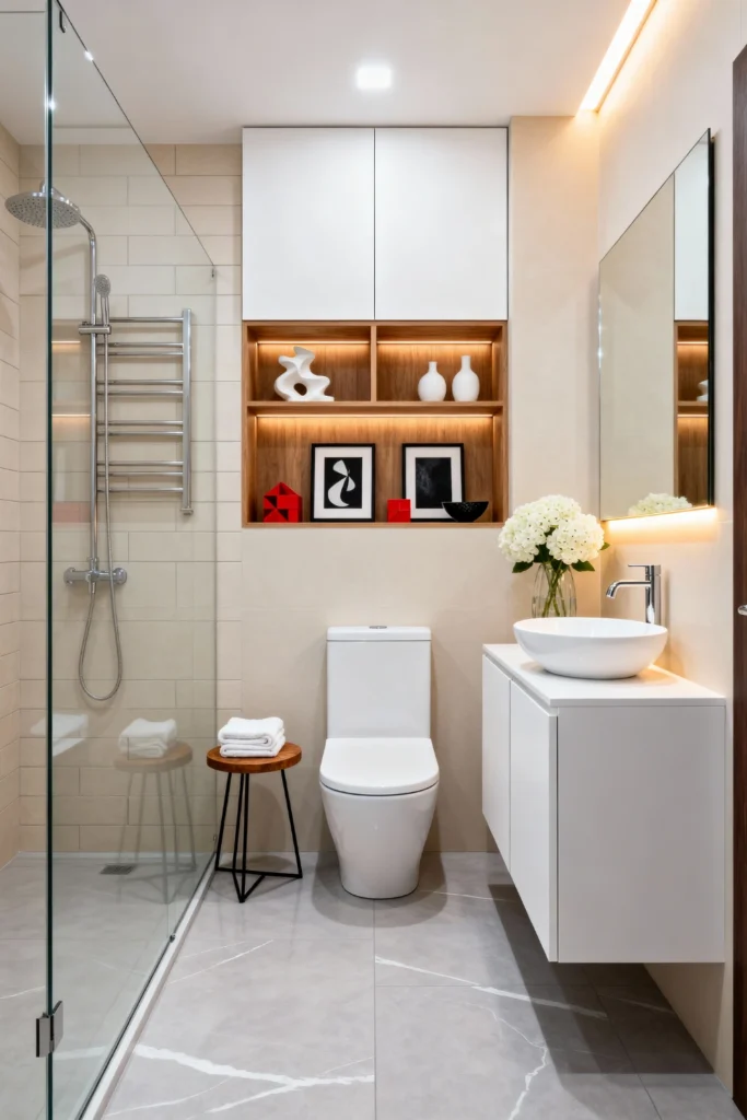 Opt for a sleek, white floating vanity to instantly make your bathroom feel larger. Build in a warm wooden shelving niche above the toilet to display minimalist art and sculptural ceramics. Use large, soft beige tiles on the walls and floor to create a seamless, spa-like atmosphere. Install a clear glass shower screen to keep the sightlines open and airy. Finish the look with a simple, rimless mirror and a fresh bouquet of white hydrangeas to add a touch of life.