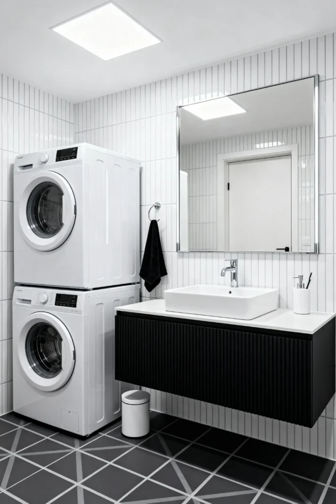 Maximize your space by stacking your white washer and dryer neatly in the corner. Install a black, fluted floating vanity to add incredible texture and a modern edge to the room. Use clean, vertically stacked white subway tiles to make the ceiling feel higher and the space brighter. Lay dark grey floor tiles with bold, white geometric grout lines for a fun, dynamic foundation. Hang a large, frameless square mirror to bounce the overhead light around this highly functional space.