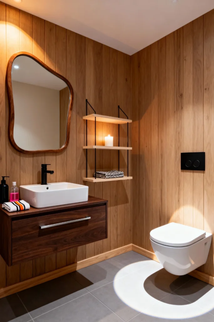 Wrap your walls in vertical, light-toned wood panels to bring a cozy, cabin-like warmth indoors. Hang an asymmetrical, organic-shaped mirror to break up the straight lines and add a playful touch. Mount a rich, dark walnut floating vanity to contrast beautifully with the lighter wood walls. Install simple black metal and wood wall shelves to hold fresh towels and a glowing candle. Use soft, directional lighting to highlight the textures and create a truly inviting, relaxing retreat.