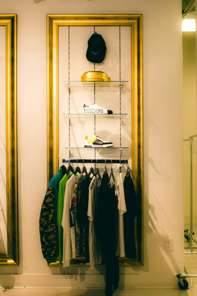 Frame your wardrobe area with a large, ornate gold molding to create a sophisticated focal point on the wall. Install floating glass shelves inside the frame to showcase your favorite sneakers or designer bags like trophies. Mount a sleek chrome rail directly below the shelves for your statement jackets. This approach turns a blank wall into a high-end boutique display right in your bedroom.