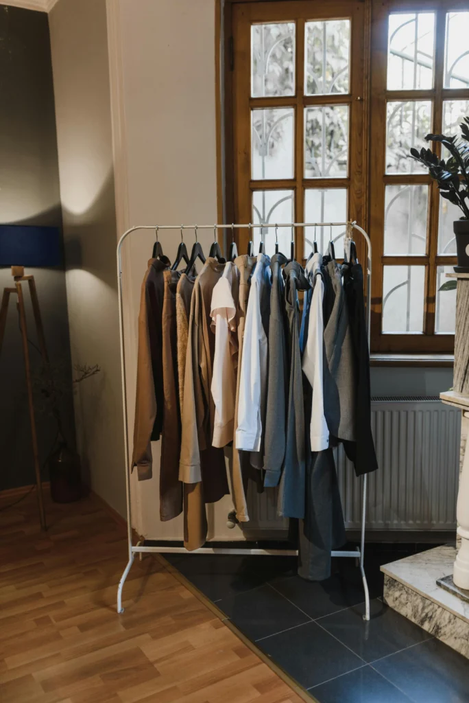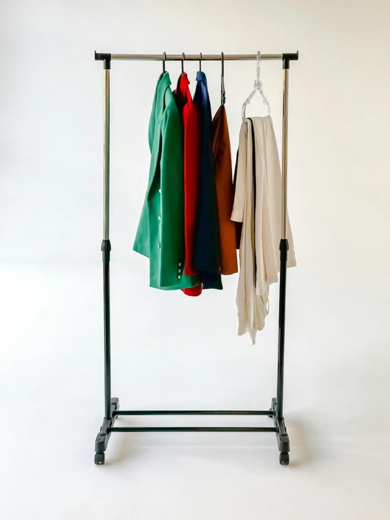 Utilize a simple, height-adjustable chrome rack to separate your boldest pieces from your daily basics. Hang vibrant jewel-toned blazers—think emerald green, ruby red, and sapphire blue—together to create an energetic focal point. Keep the surrounding walls and floor stark white to let the colors truly stand out. This method turns your “special occasion” wear into a daily piece of art.