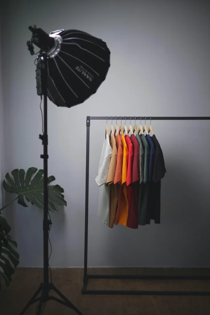 Organize your basic t-shirts strictly by color to create a satisfying, seamless rainbow gradient. Use identical light wood hangers to ensure the focus remains entirely on the fabric colors rather than the hardware. Add a large potted monstera or leafy green plant nearby to bring a burst of life and a natural contrast against the solid blocks of color.