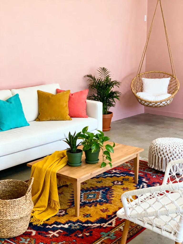 Using vibrant colors is a fun way to make your living room feel warm and inviting. A bold pink wall can really set the tone, allowing you to mix in furniture and decor with complementary hues. Don’t shy away from playful patterns and textures; they add personality and charm to your modern boho retreat.