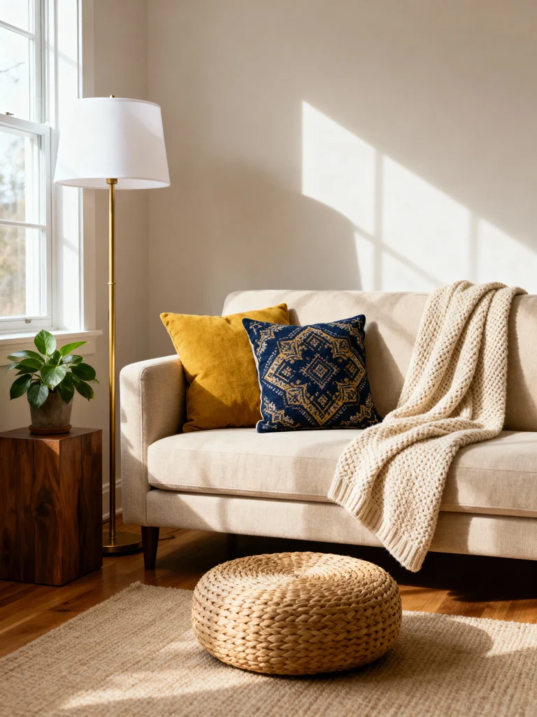 Adding layers of textiles is a simple way to bring warmth and comfort to your living room. Think about mixing and matching pillows, throws, and rugs that showcase different textures and colors. This not only creates a cozy vibe but also gives your space that modern boho flair!