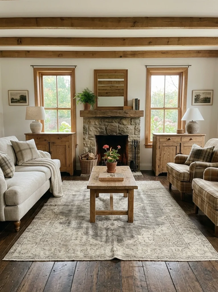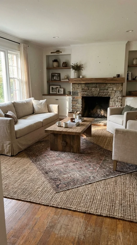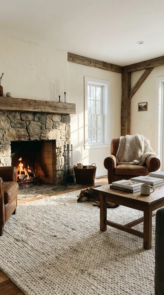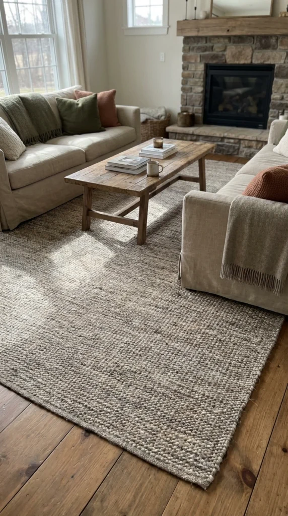 If you have a fireplace, you absolutely need a neutral wool rug. Wool adds an unmatched layer of softness that beautifully contrasts with raw stone or brick hearths. Try a creamy off-white or taupe wool rug placed right in front of the fire (at a safe distance, obviously). It practically begs you to sit on the floor with a cup of coffee. This approach is all about creating that warm rustic home décor vibe where people actually want to hang out.