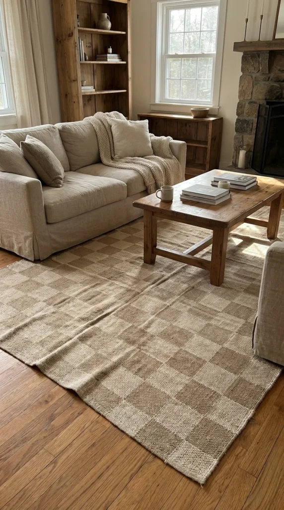 Plaid and checkers scream farmhouse, but we aren’t talking about bright red picnic blankets here. Look for subtle checkered patterns in muted tones like beige and cream. These work beautifully under a solid-colored sofa, adding just enough visual interest without fighting the rest of your decor. What NOT to do? Avoid too modern patterns with sharp, high-contrast black and white, which can feel way too contemporary and cold for a relaxed country aesthetic.