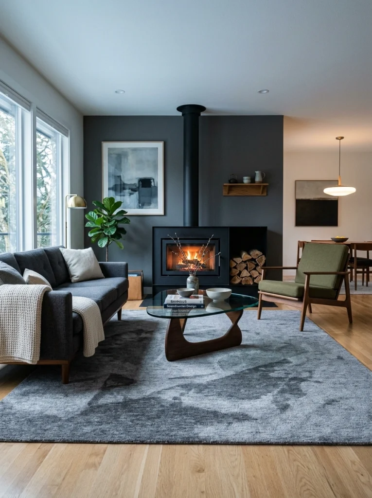 For the minimalist or mid-century modern enthusiast, a sleek, low-pile rug is the answer. It defines the space without adding visual clutter, keeping the focus on the clean lines of the room and the fireplace itself.