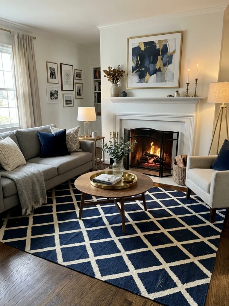 Geometric rugs bring energy and a modern edge. They can feel incredibly upscale when done right, defining the fireplace area with clean lines and a bold personality.